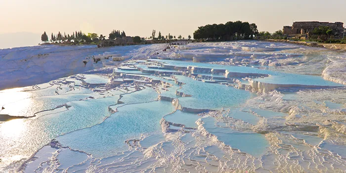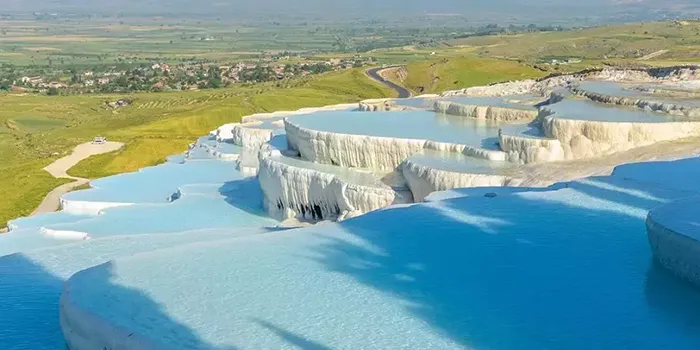 Pamukkale, Türkiye’nin batısında, Denizli iline bağlı bir ilçe olan ve beyaz traverten teraslarıyla ünlü bir doğa harikasıdır. Pamukkale turu yapanlar, bu benzersiz doğal oluşumu ve antik Hierapolis şehrini keşfetme fırsatı bulurlar. Pamukkale’nin travertenleri, doğal termal kaynaklardan çıkan kalsiyum karbonatın birikmesiyle oluşmuş beyaz renkli basamaklarıyla görülmeye değer bir manzaradır. Ziyaretçiler aynı zamanda Pamukkale’ye adını veren “pamuk gibi” yumuşak dokuya sahip travertenlere de dokunabilir ve yürüyebilirler.